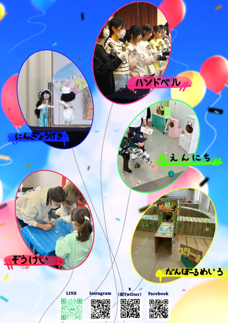ハンドベル、人形劇、縁日コーナーなど、お子様からお年寄りの方まで楽しめる企画をご用意しております。「一緒に遊ぼう!空の世界~チャイルドフェスティバル~」をテーマに、学生一同心をこめて準備中です!