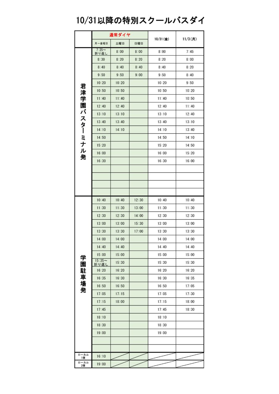 10/31以降の特別スクールバスダイヤについて