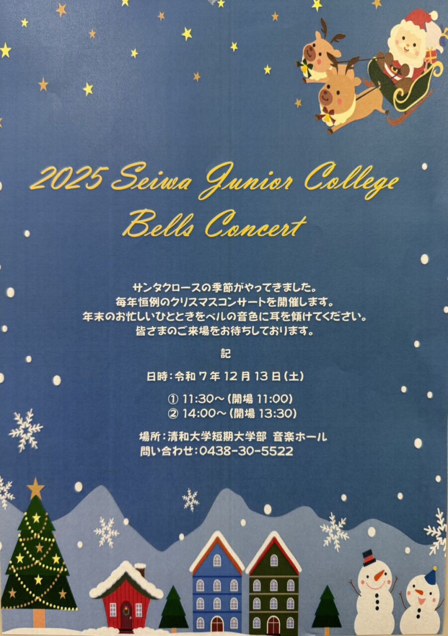 短大では日頃お世話になっている皆様に、イングリッシュハンドベルの音色をお届けしたいと思い、演奏会の計画を立てております。年末のお忙しいひとときを、ベルの音色に耳を傾け、クリスマスの雰囲気に浸ってみるのはいかがでしょうか。皆様お誘いあわせのうえ、お出かけください☺✨