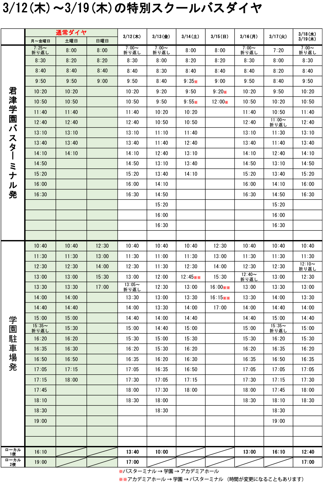 3/12~3/19の特別スクールバスダイヤについて