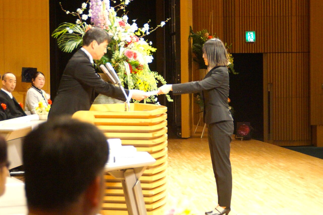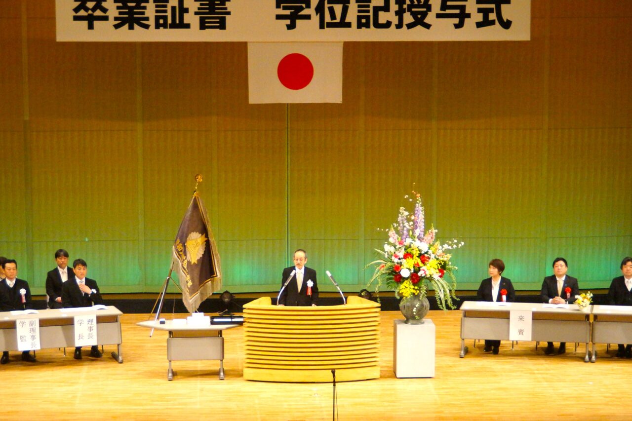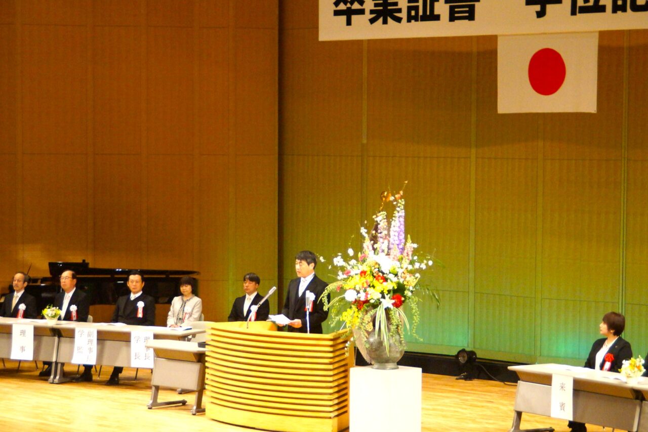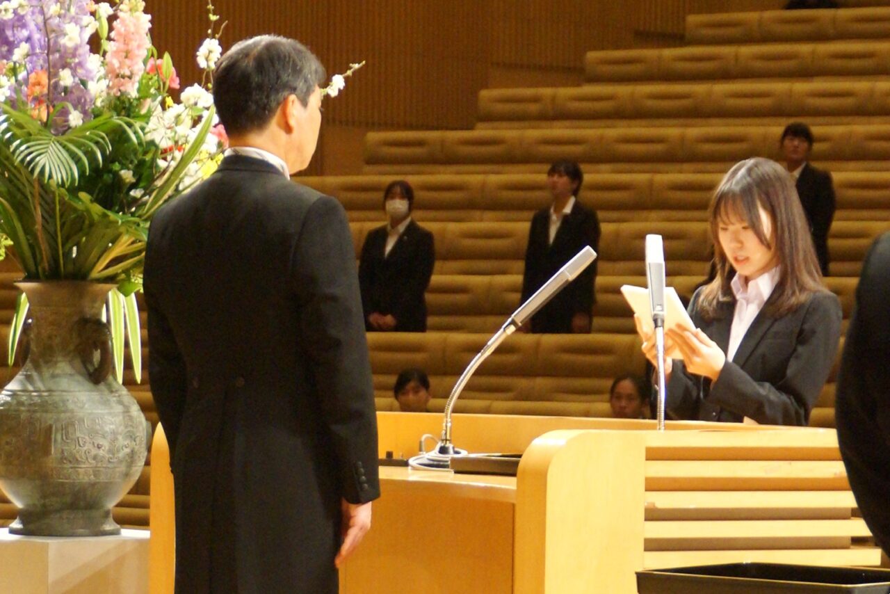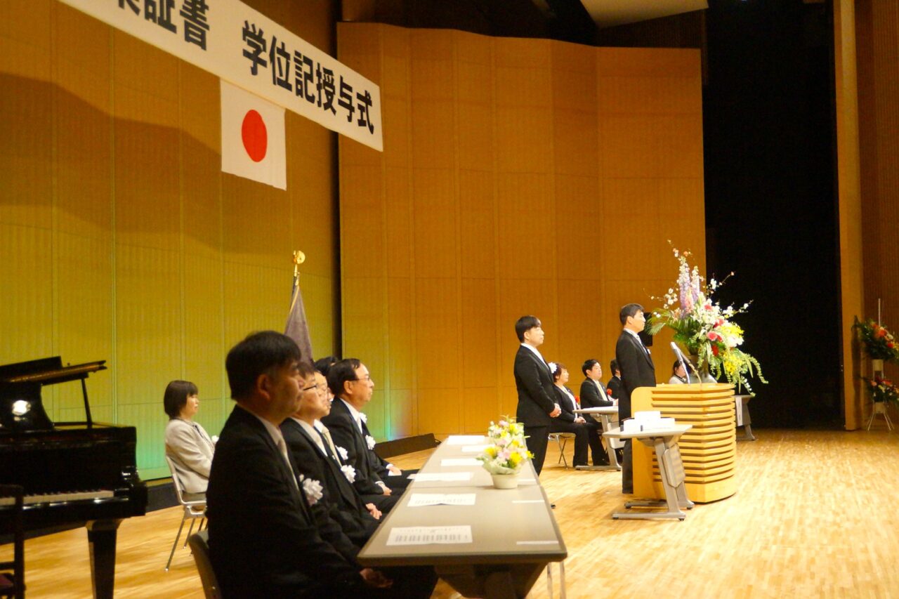 真板学長から式辞が述べられ、来賓代表して石井君津市長からの祝辞を頂きました。その後、在校生代表からの送辞があり、卒業生代表が謝辞を述べて式典は終了しました。