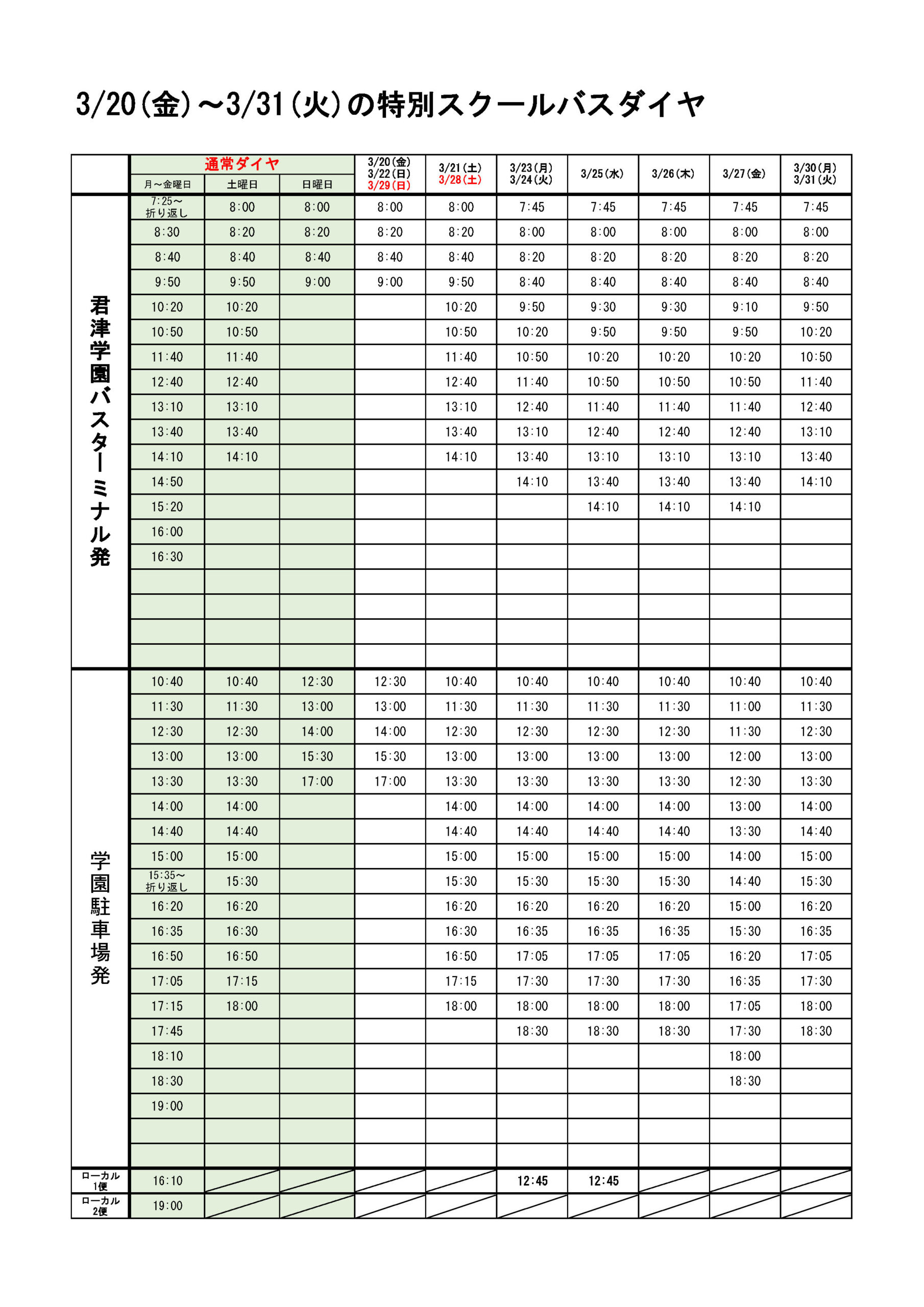 3/20~3/31の特別スクールバスダイヤについて